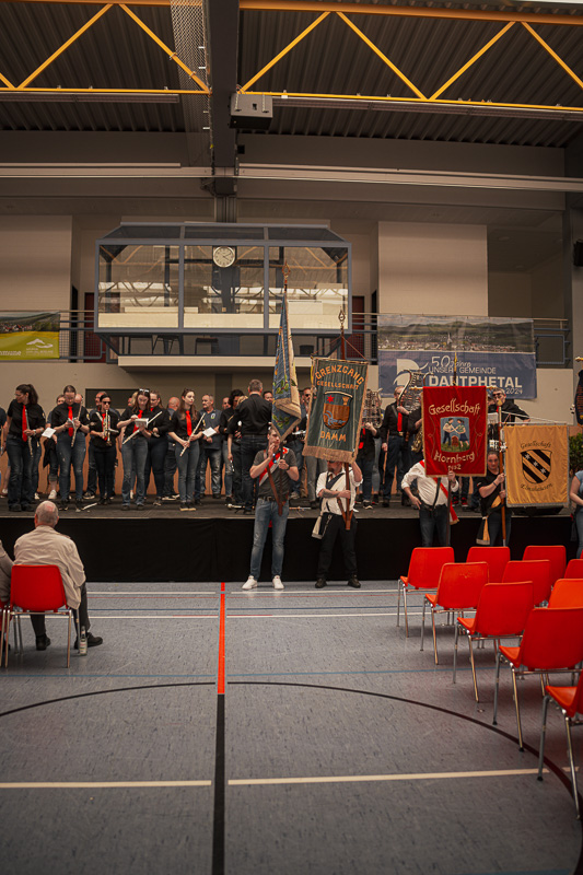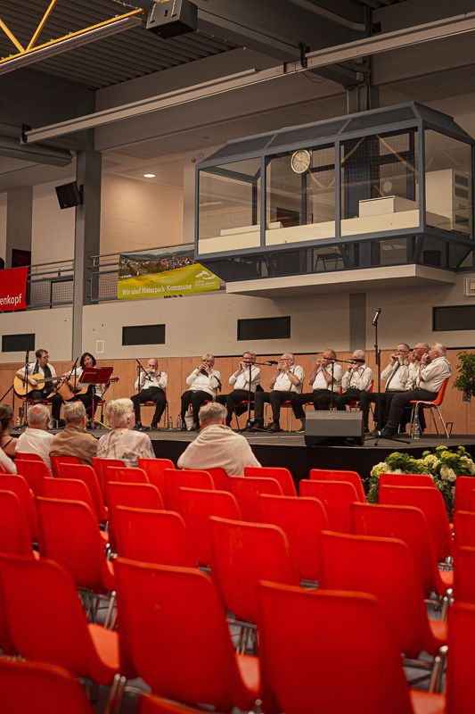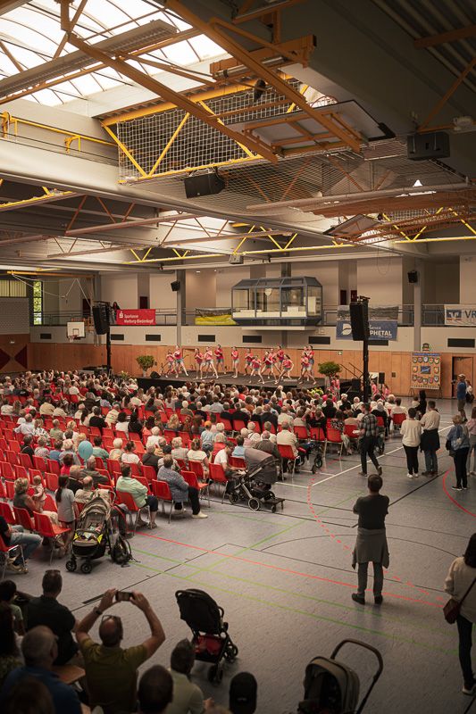 Auf der Bühne in der Halle wurde ebenfalls viel Abwechslung geboten. Die Besucher konnten Auftritte von Kindertanzgruppen, eine Trampolinvorführung, Gesang sowie Musik vom Mundharmonikatreff und vom Spielmannszug des Grenzgangsvereins genießen.