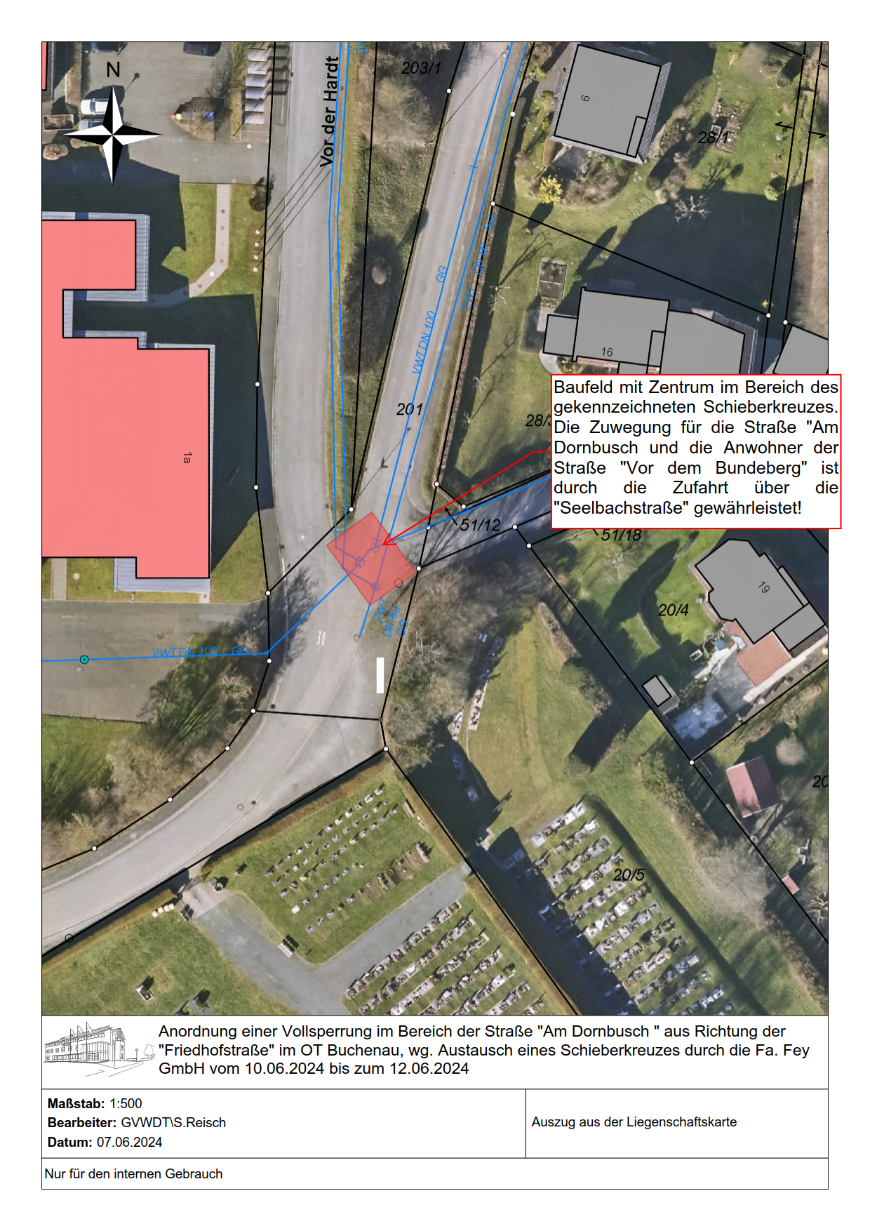 Vom 10.06.2024; 06:00 Uhr bis zum 12.06.2024 18:00 Uhr ist die Straße „Am Dornbusch“ aus Richtung der „Friedhofstraße“ in Buchenau vollgesperrt.