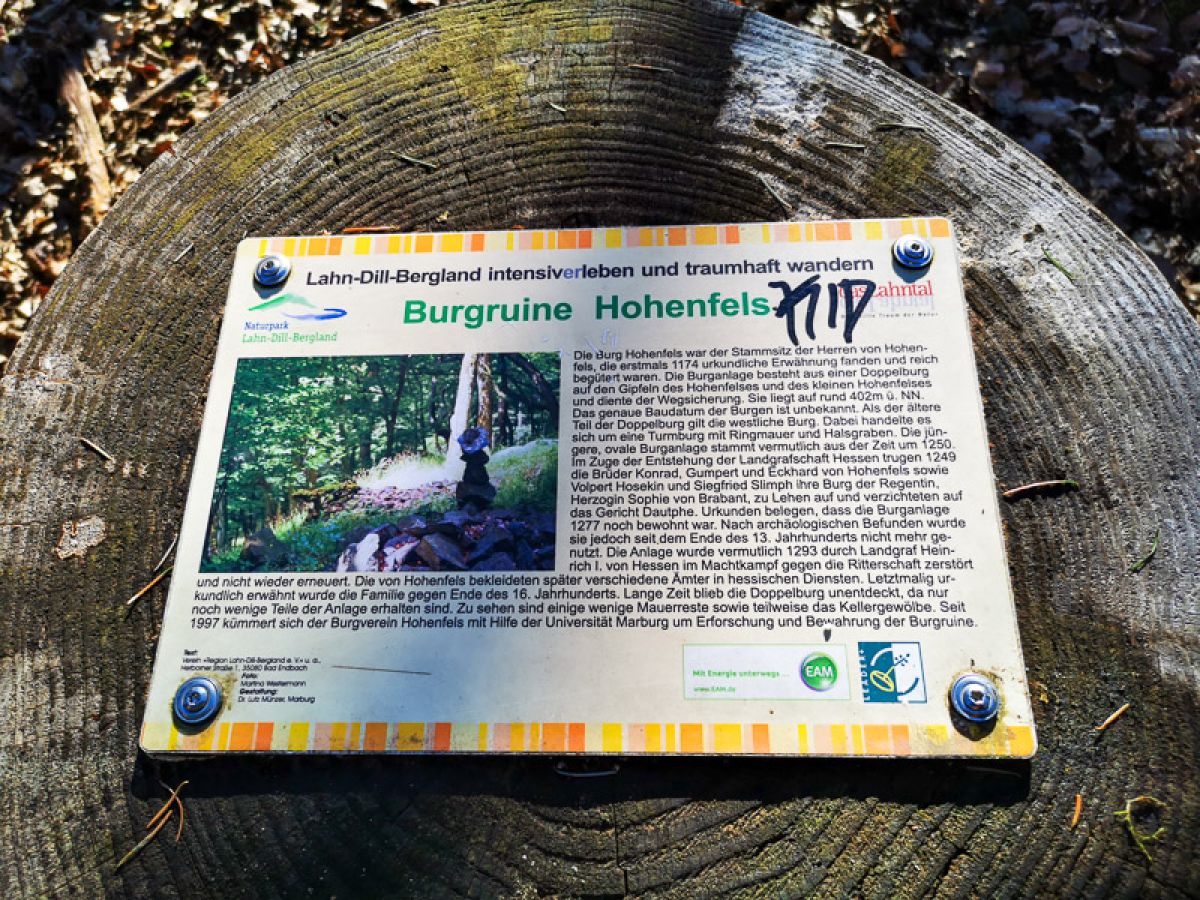 Der Wanderweg führt Sie zu beiden Burgruinen Hohenfels, die zwischen Buchenau und Allendorf liegen. Die Burgen Hohenfels waren Stammsitz der Herren von Hohenfels. Diese waren ein reich begütertes hessisches Adelsgeschlecht und wurden erstmals 1174 erwähnt. Die Geschichte der Raubritter, Hinweise zu einem Geheimgang und noch viel mehr Wissenswertes um die Hohenfelser erfahren Sie auf installierten Info-Tafeln.