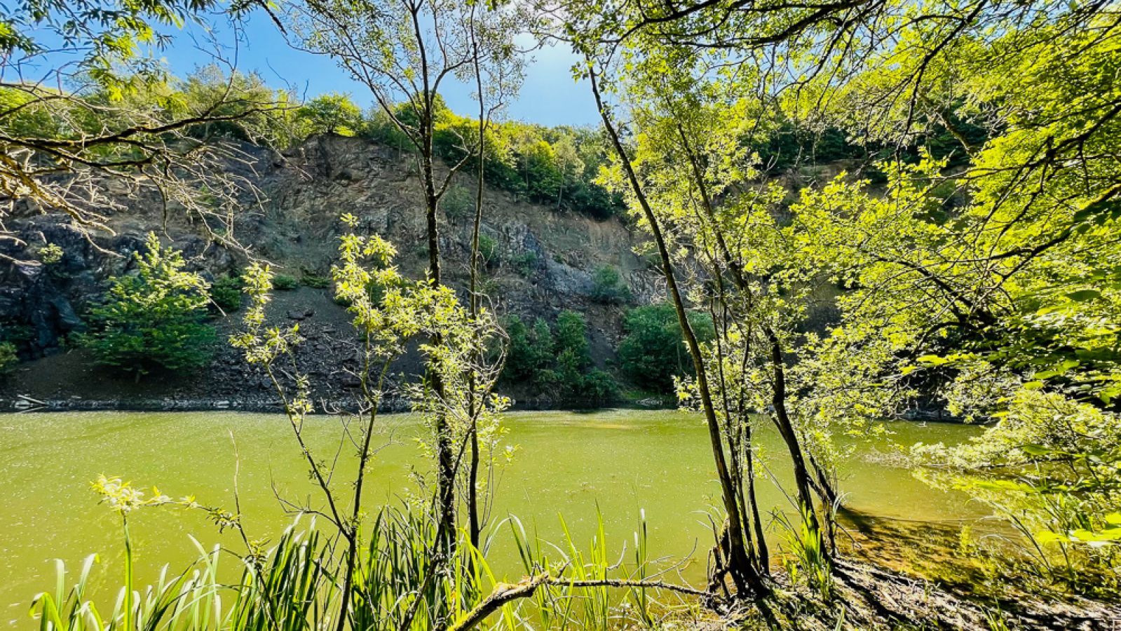 Ein romantischer Steinbruchsee liegt etwas abseits des Wanderwegs und erinnert an die Bergbaugeschichte der Gegend. Einen halben Kilometer später erkennt man bereits die historischen Gebäude der Carlshütte. Die Carlshütte entstand im Zuge der Industrialisierung 1844 als letzte Eisenhütte in der Lahnniederung. Während des Zweiten Weltkriegs wurde das Gelände mehrfach bombardiert, die heute denkmalgeschützten Gebäude blieben aber von größeren Schäden verschont.