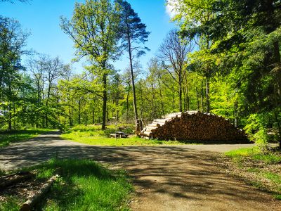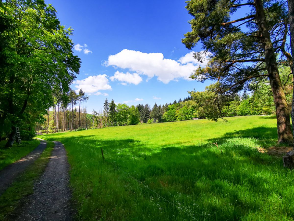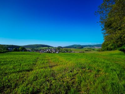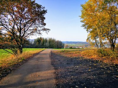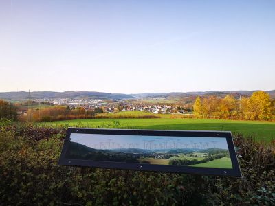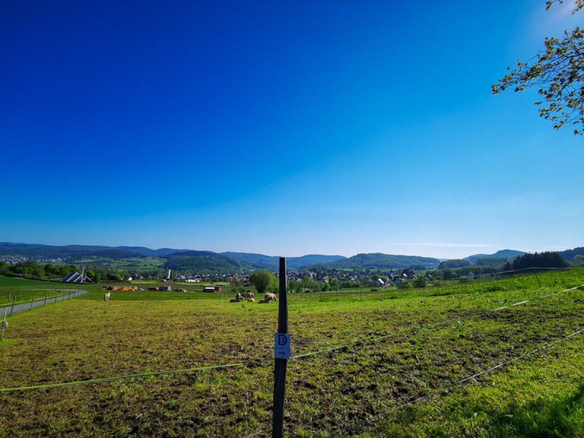 Danach führt die Strecke aus dem Wald heraus und man erreicht die Schutzhütte Friedensdorf. Nun ist in etwa die Hälfte des Weges geschafft. An der Schutzhütte in Friedensdorf kann man eine Rast einlegen: Von hier hat man nicht nur eine wunderschöne Sicht auf Friedensdorf und Dautphe, sondern kann auch das Biedenkopfer Schloss am Ende des Lahnbeckens sehen.