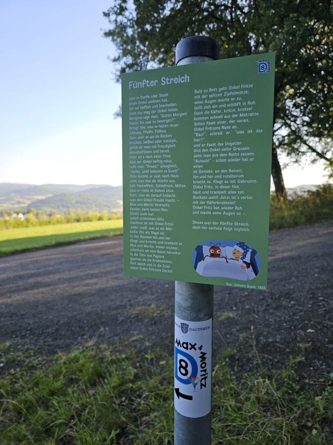 Der Wanderweg beginnt und endet am Bürgerhaus in Friedensdorf. Weiter geht es vorbei am Friedhof und dem Fjordgestüt. Ihr könnt eine Pause am Schlinketeich oder der Schutzhütte einlegen und im Tretbecken die Füße erfrischen. Unterwegs kommt ihr immer wieder an verschiedenen Stationen vorbei, an denen auf Hinweistafeln die Streiche von Max und Moritz erzählt werden. Ob den beiden wohl alle Streiche gelingen und sie ohne Strafe davonkommen? Unterwegs werdet ihr es herausfinden!